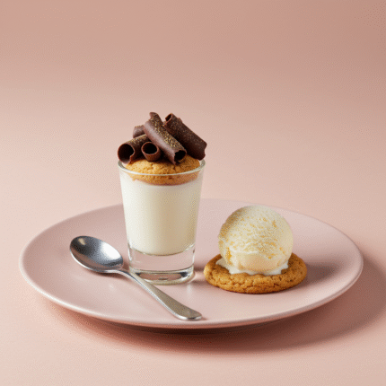 milk cookie dough, milk chocolate shot glass, milk chocolate curls and vanilla gelato or Ice cream (950 kcal) Allergens:🌾(G), 🥛(D), 🥚(E)