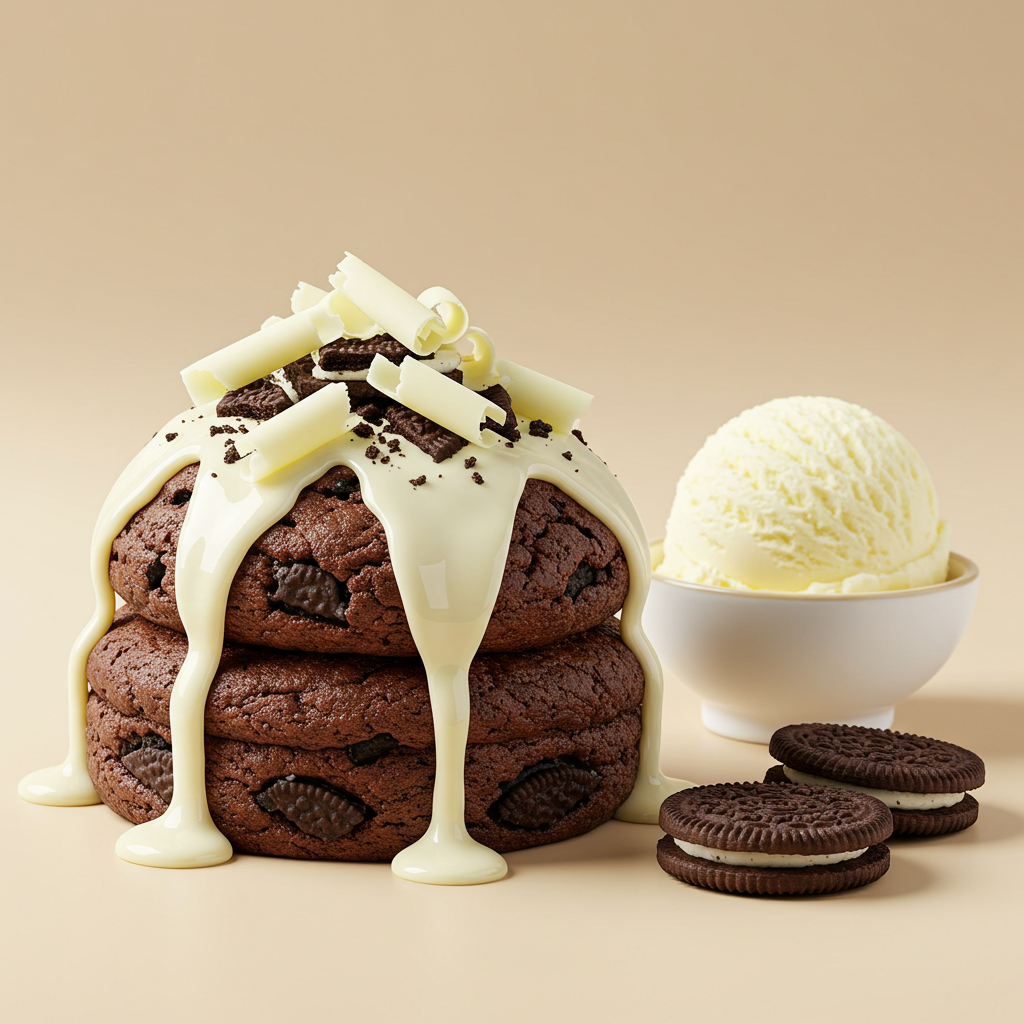 Oreo biscuits, white chocolate sauce, and curls —