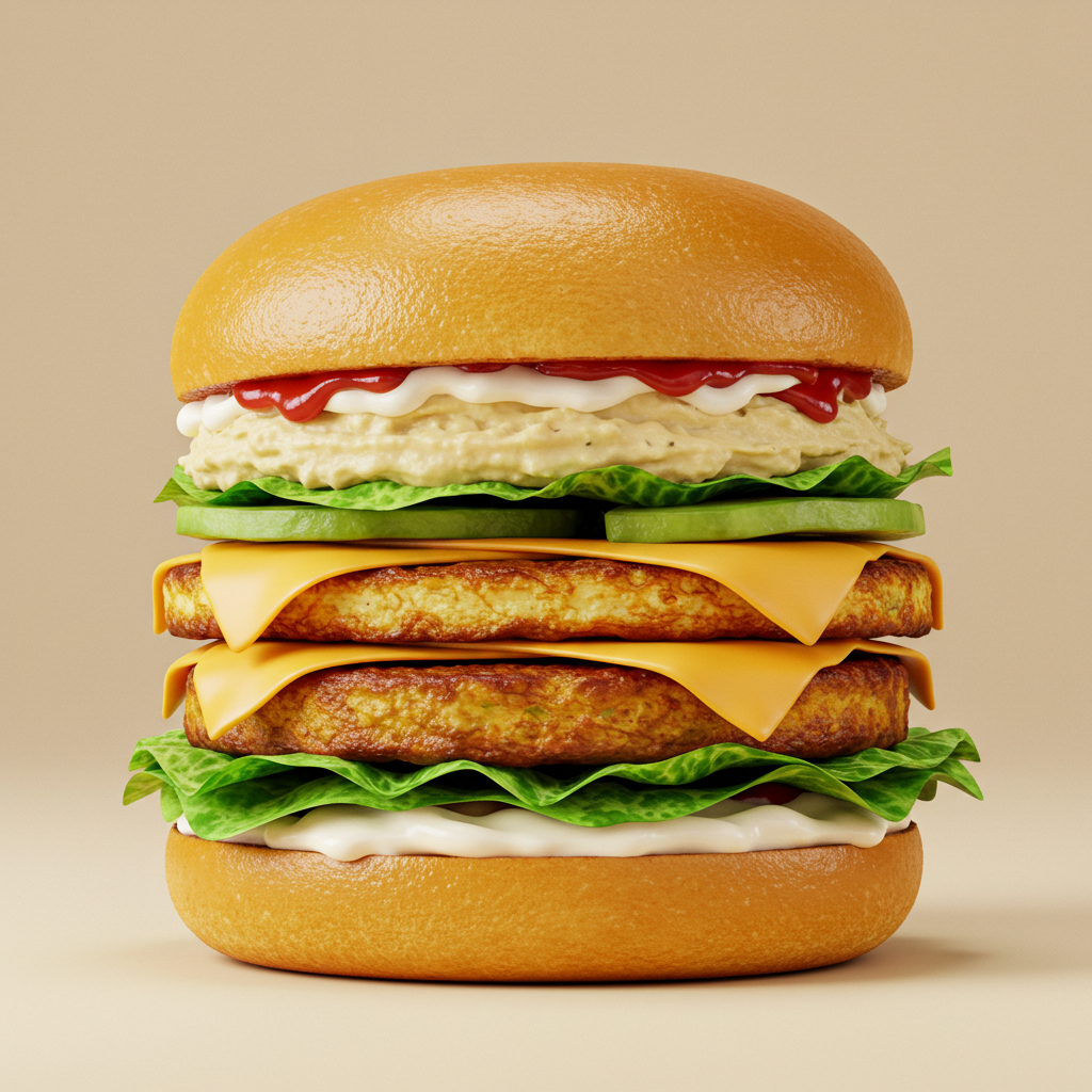 stacked with Halloumi, avocado, double cheese, hummus, fresh salad, mayo & ketchup in a toasted bun. (620 kcal) Allergens: 🌾 (G)🥜 (N) 🥛 (D) 🥚 (E) 🌱(V)